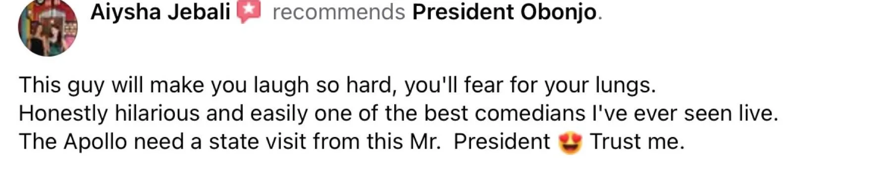 President Obonjo has attracted legions of fans thanks to his party political broadcasts on social media, NextUp Comedy specials and declaration of war on Wakanda. A beloved character on the comedy circuit, he is in demand as an MC and headliner.